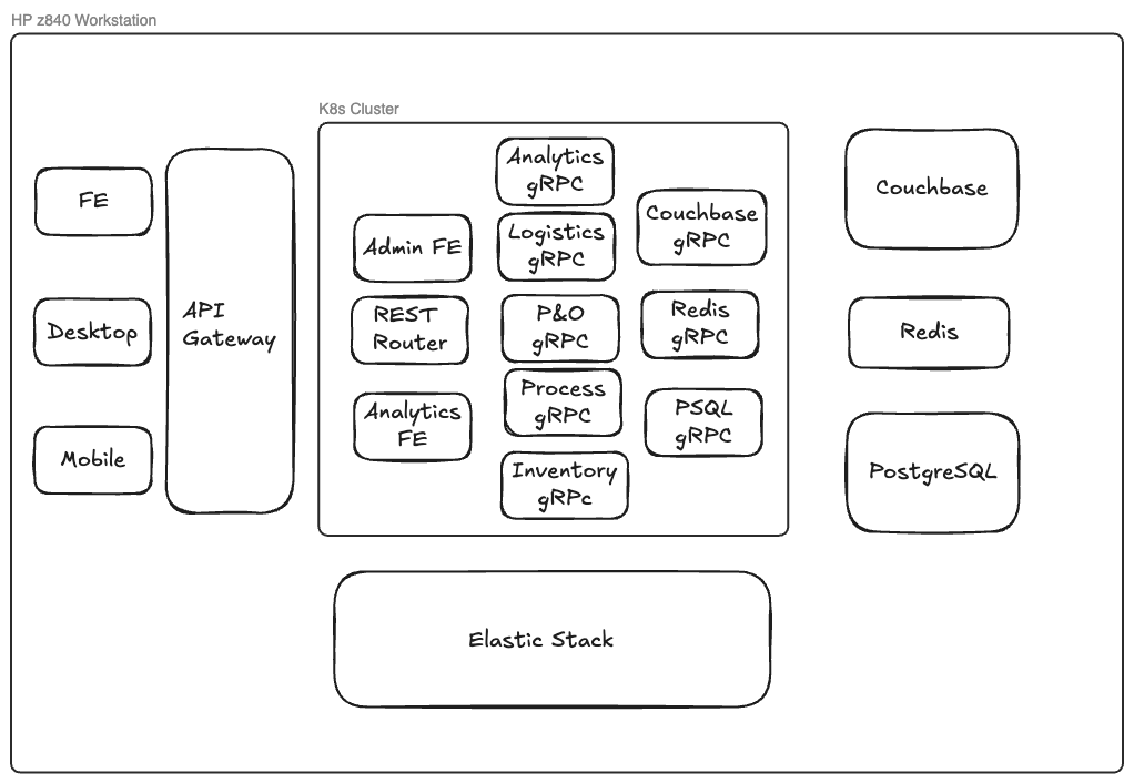 - services for Logistics, high rate transactions, persistence etc are gRPC Go or Rust k8s services with independent repos and deployments.